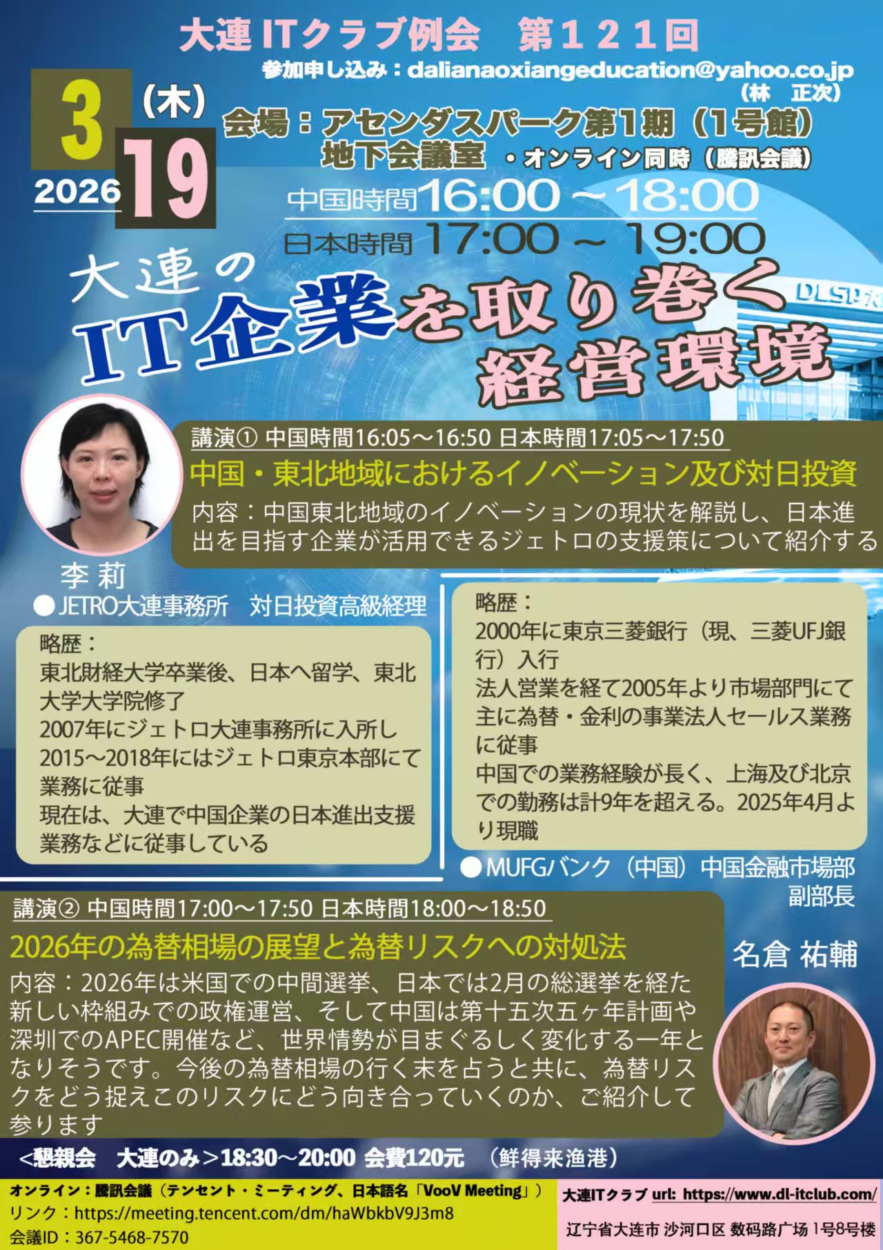 ご参加の方:『お名前 + 組織名 + ご所属 + 例会参加(○×)(オンライン/大連会場)+ 大連懇親会参加(○×)』を