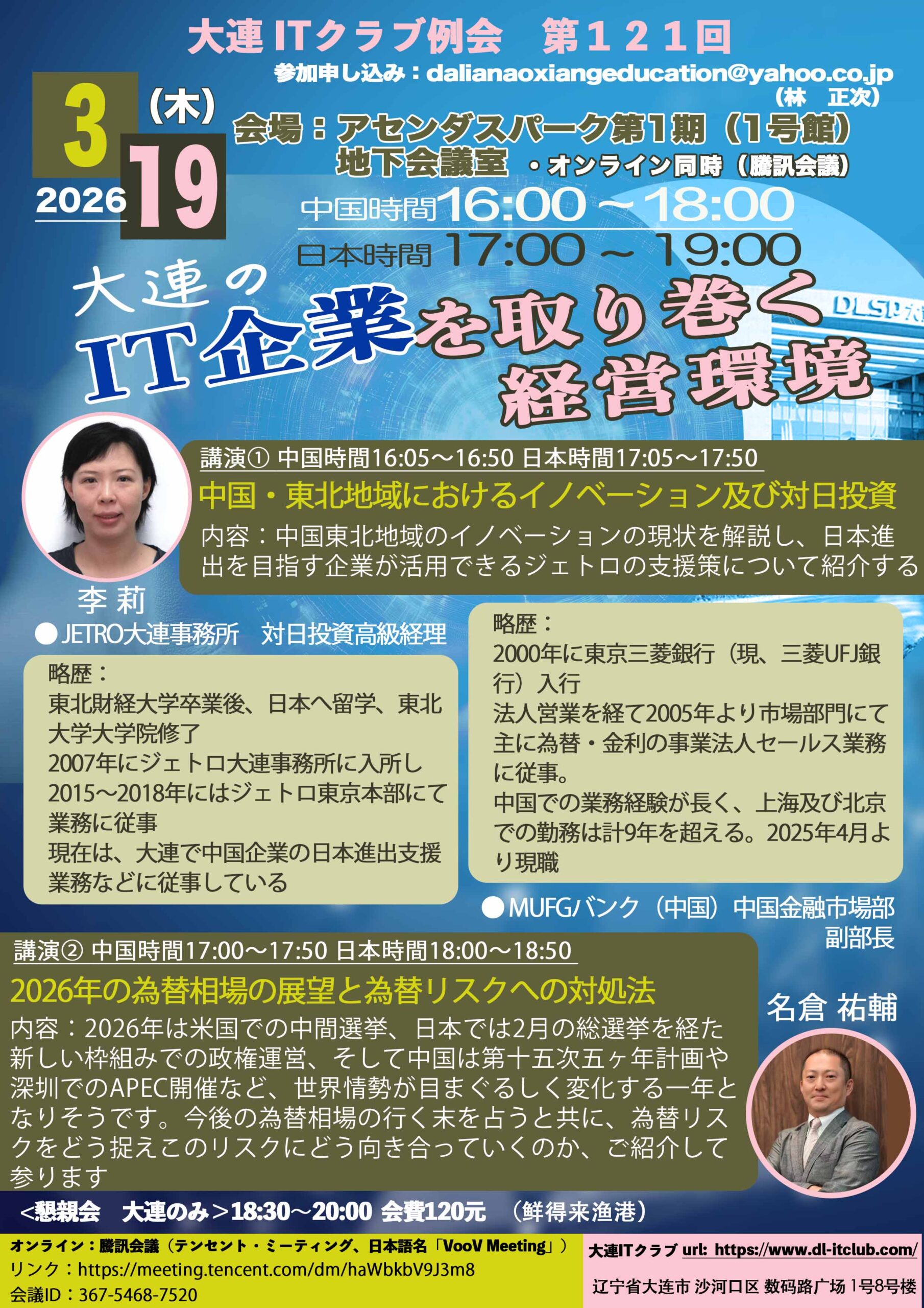 ご参加の方:『お名前 + 組織名 + ご所属 + 例会参加(○×)(オンライン/大連会場)+ 大連懇親会参加(○×)』を